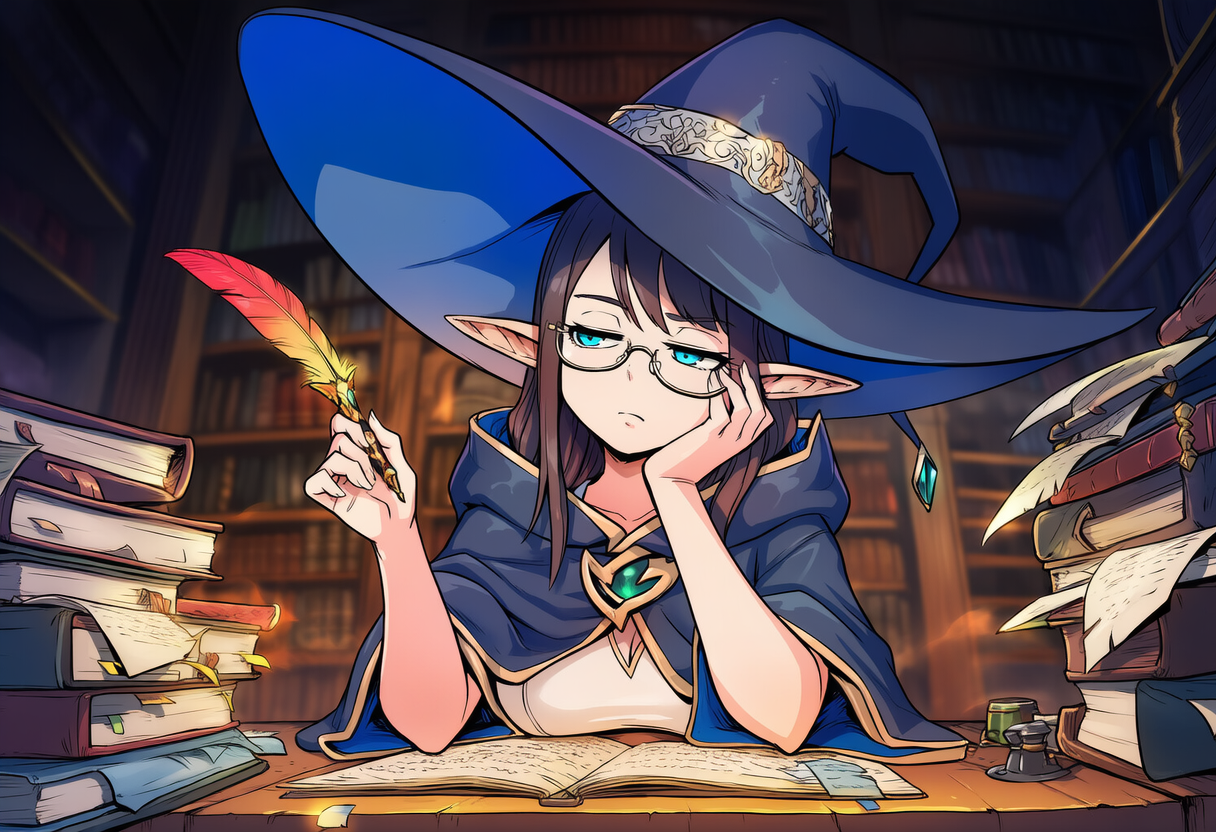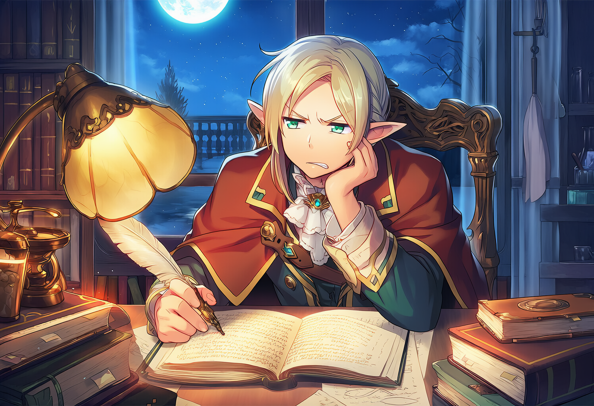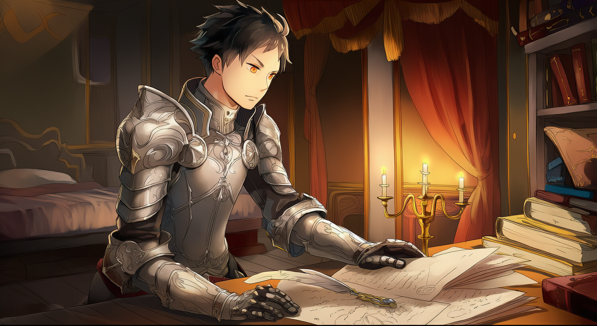 The Prince can’t help but pity her position, for there is a collection of papers and books strewn about her work space. She’s barely holding a glowing black feathered pen, looking ready to take a nap rather than continue writing away.